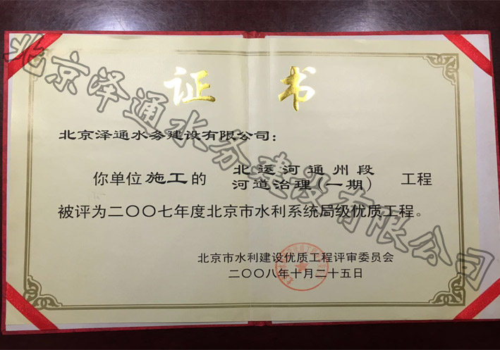 2007年度北京市水利系統(tǒng)局級(jí)優(yōu)質(zhì)工程證書(shū)