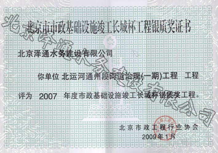 2007年度北京市市政基礎(chǔ)設(shè)施竣工長(zhǎng)城杯工程銀質(zhì)獎(jiǎng)證書(shū)